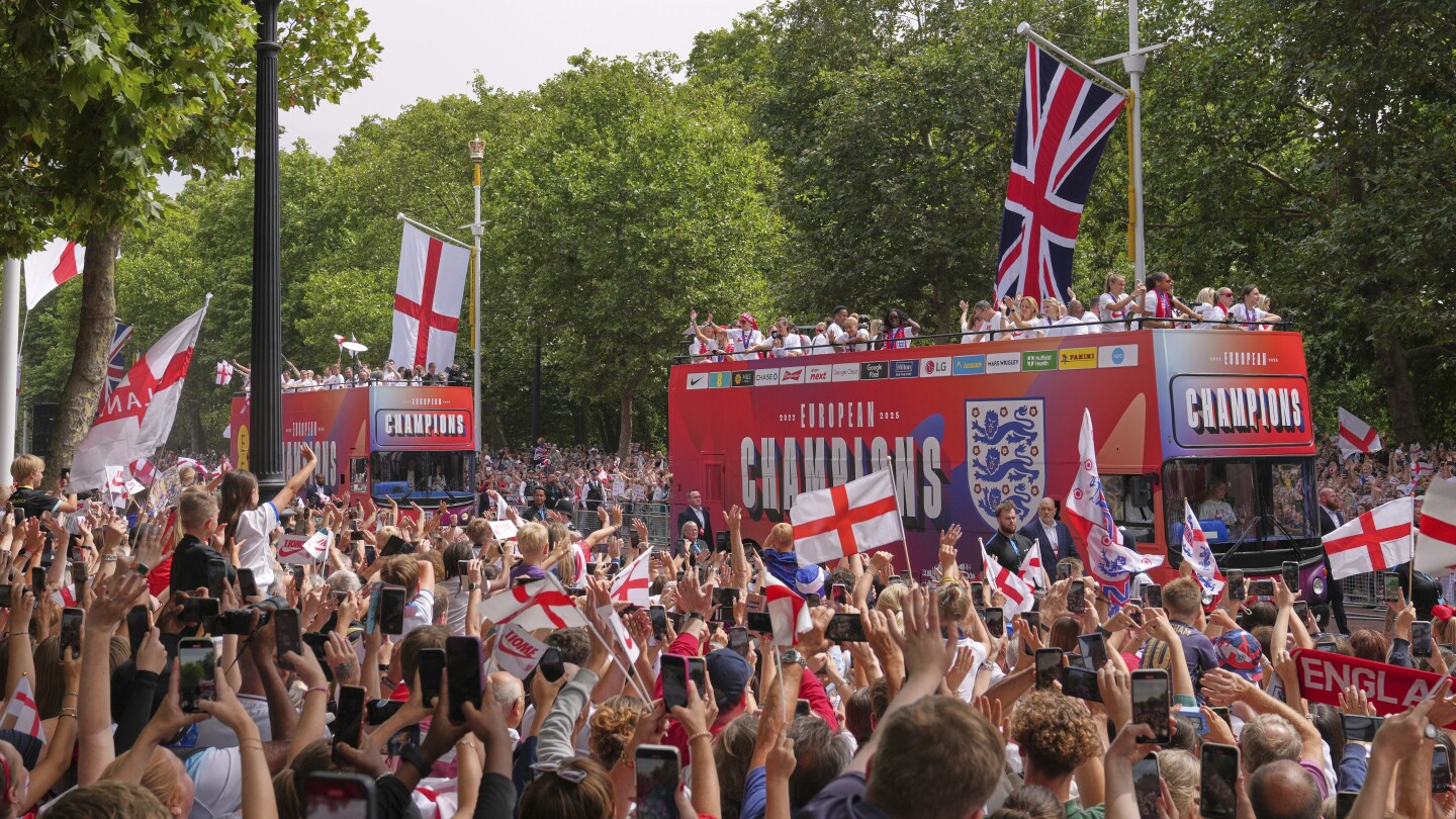 LONDON (AP) – Thousands of fans lined up at a mall in central London to celebrate England’s Euro 2025 victory. England I successfully defended that title She defeated world champion Spain by penalty shootout in the final of the Women’s European Championships in Basel on Sunday.