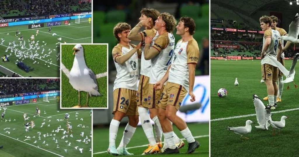 Australia’s premier football match was called off after a flock of seagulls invaded the pitch and landed on the spot where a free-kick was taken in the final minute. A strange flock of seagulls appeared during the A-League match between Melbourne Victory and Newcastle Jets at AAMI Park in Melbourne.